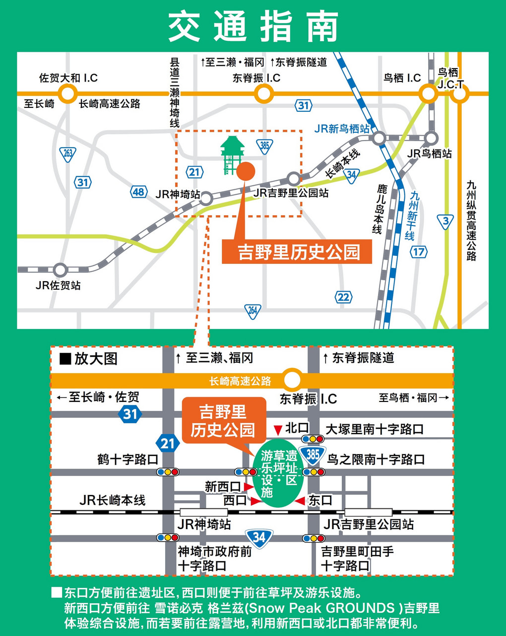 | JR佐贺站 | 乘长崎线普通电车,到JR神埼站大约9分钟, 或到JR吉野里公园站大约12分钟 ※从JR神埼或JR吉野里公园站徒步大约15分钟 |