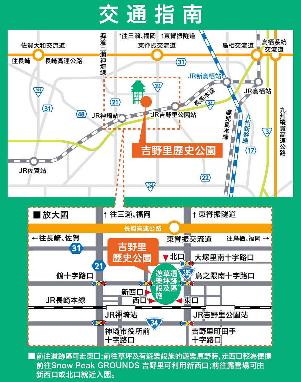 | JR佐賀站 | 乘長崎本線普通電車,到JR神埼站大約9分鐘。 或到JR吉野裡公園站大約12分鐘。 ※從JR神埼或JR吉野裡公園站徒步大約15分鐘。 |