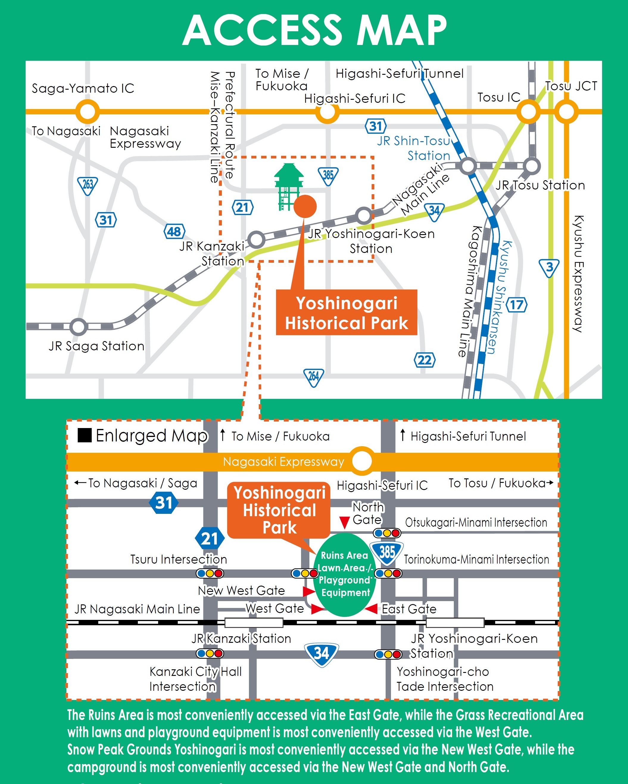 | JR Saga Station | JR Nagasaki Honsen Line local train to JR Kanzaki Station approximately 9 min JR Yoshinogari Park Station approximately 12 min. *From JR Kanzaki Station and JR Yoshinogari Koen Station it takes 15 on foot |