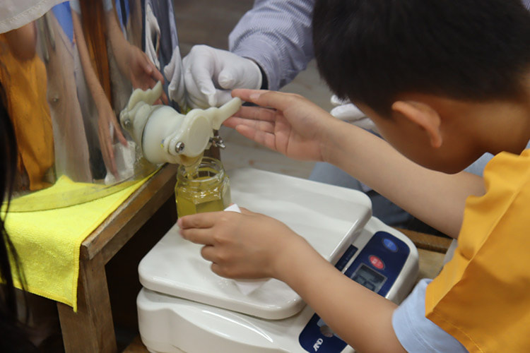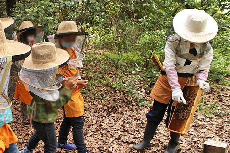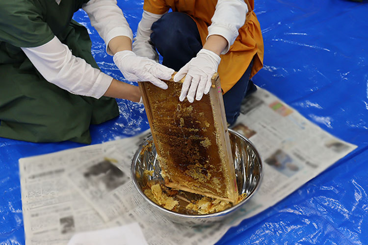 園内に設置した養蜂箱に集めたハチミツの採取や瓶詰め作業を体験します