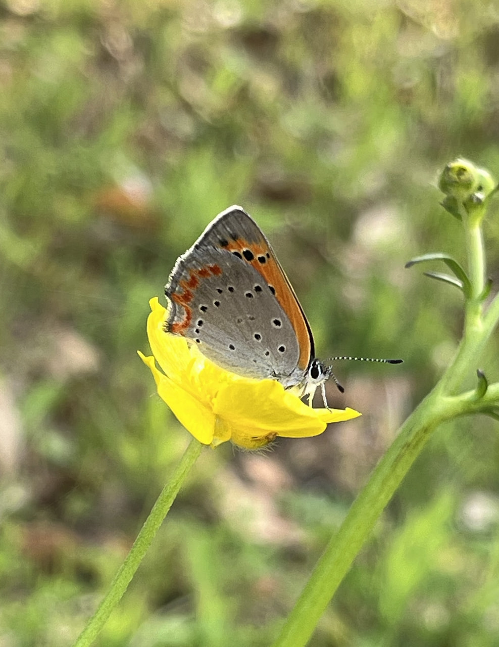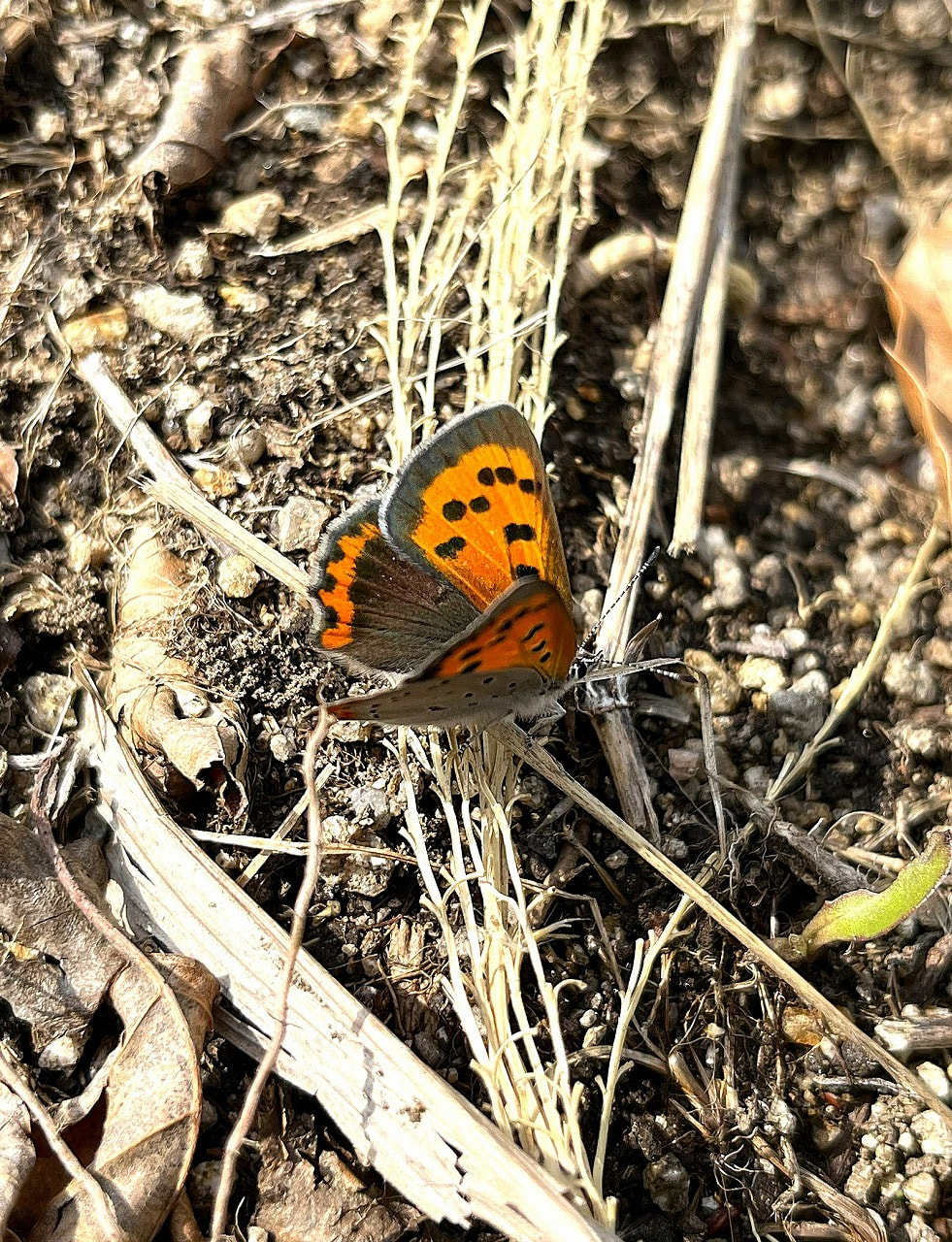 園内にたくさん生息しています。写真の蝶は、翅の模様(表面)がオレンジ色なのに「ベニシジミ(紅シジミ)」と言います。なぜだろう?英語では「Small Copper(小さな銅)」...オレンジ色なのに銅色??