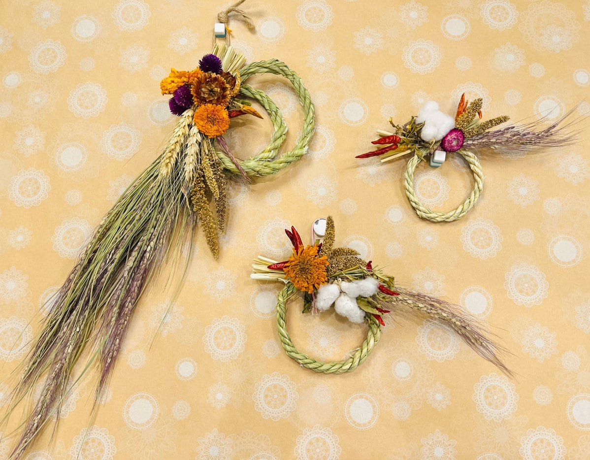 稲ワラでしめ縄を作り、ドライフラワーなどで飾ってしめ飾りを作ろう!