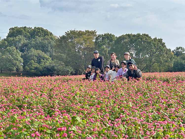 抜けるような青空にルビーの宝石のような紅(あか)ソバとのコントラストをお楽しみいただけます。11/1(土)・2(日)には「蕎麦のそばカフェ」を開催しました。園内産の蕎麦粉を使ったかけ蕎麦やポン菓子の振る舞い、クッキーづくりやソバの花の箸置きづくり等、一面広がる紅(あか)ソバ畑の横で多くのお客様に楽しんで頂けました。