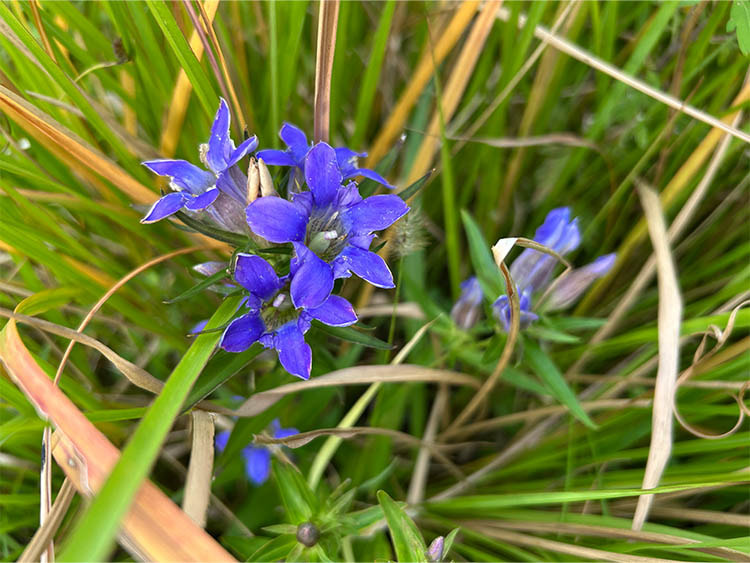 草むらの中で釣鐘型の花が上向きに咲いています。深い青紫色の花色に趣を感じます。
