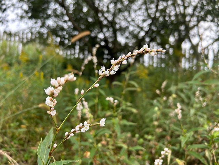 秋風に揺れて高く伸びた細い花茎の先についた白い小花が上品に咲いています。