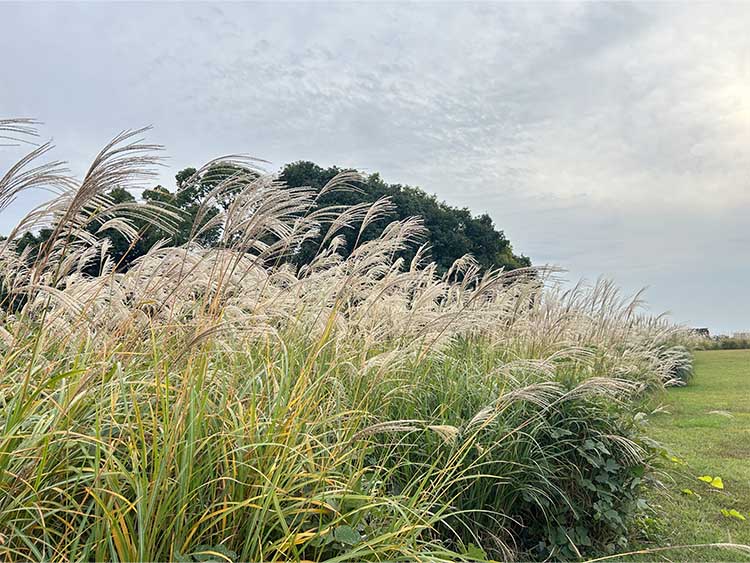 秋の七草の一つで尾花とも言われています。ふわふわの穂が秋の陽ざしに照らされて美しい秋の風景を創り出しています。