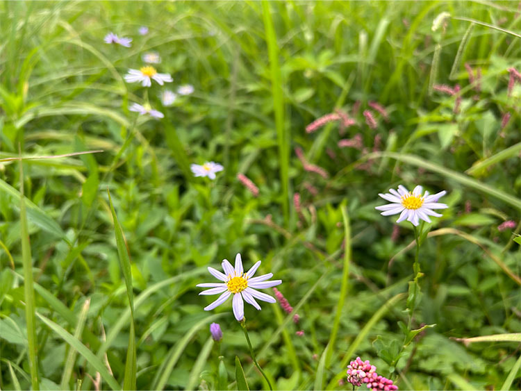 足元で薄紫色の可憐な花が咲き、優しい花姿に癒されます。