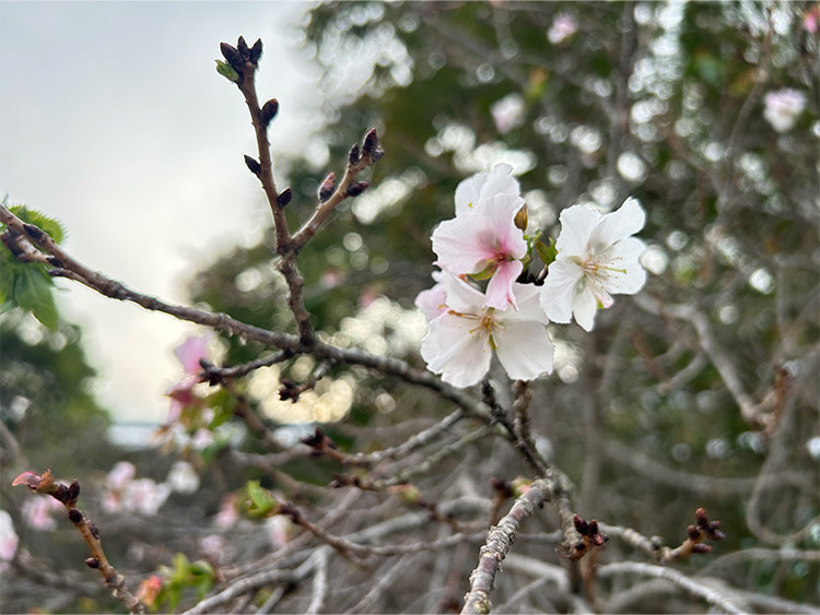 春と秋から冬にかけて咲く二季咲きのサクラです。花数は多くないですが可憐な花に趣を感じます。