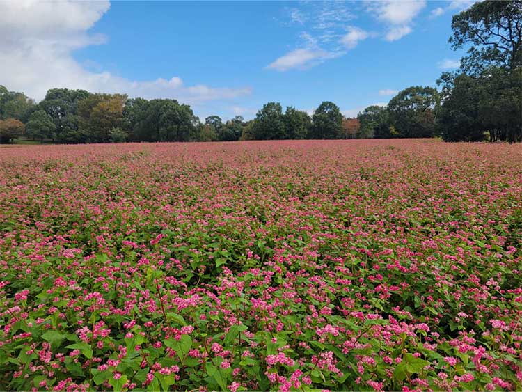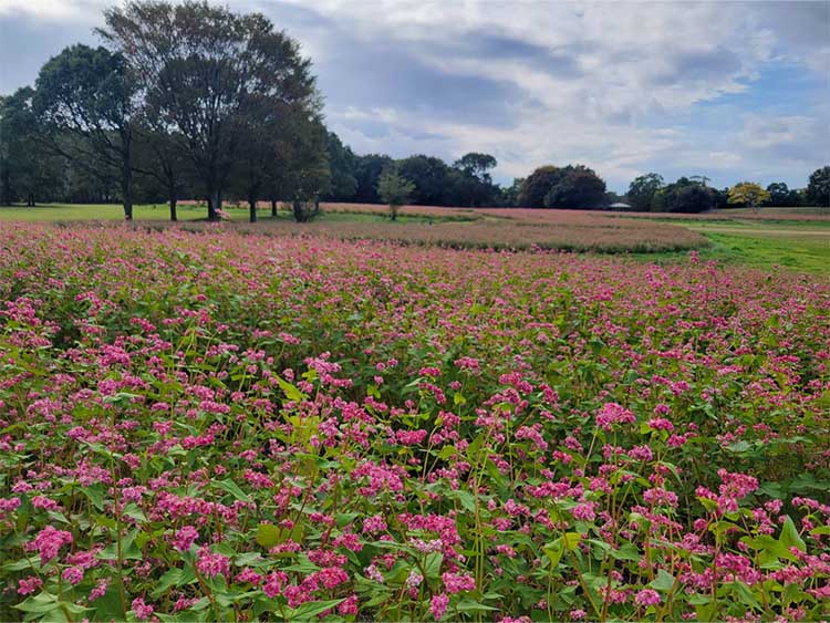吉野ヶ里の秋の風物詩である紅(あか)ソバが美しく咲き誇っています。他にも園内では秋を彩る草花が可憐に咲いています。