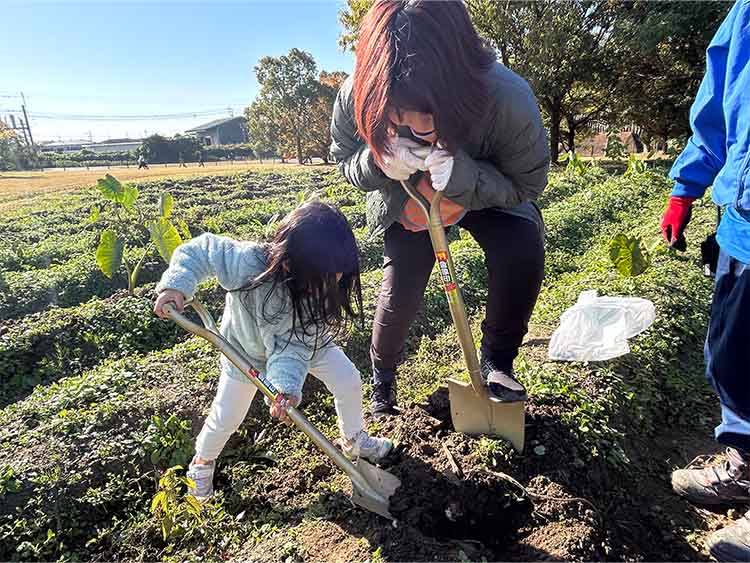 11月30日、サトイモ収穫体験を開催しました。初めて体験される方が多く、宝探しのような感覚で楽しんでいただきました。「なぜ宝探しなのか?」それは、立派な葉の下に必ず大きな里芋が実っているわけではありません。見えている地上部だけでは、地下部の状態がわからないためです。掘ってみて初めてわかる、ワクワク感がありますね。