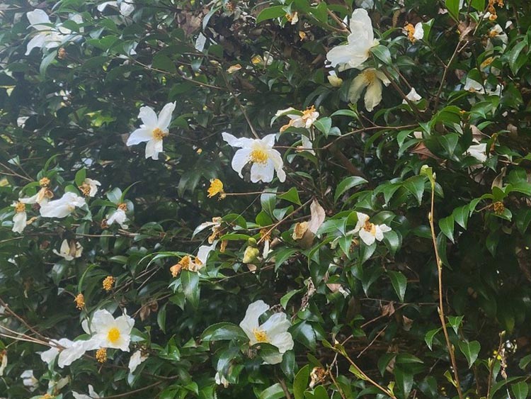 白い可憐な花が咲いています。名前の通りチャノキの葉は身近な飲み物の原料です。