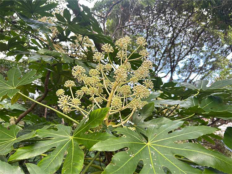 大きな葉の間からスッと立ち上がった花枝に、緑色の実をたくさんつけています。葉っぱの形状から「天狗のうちわ」とも呼ばれ、玄関先に飾ると魔除けになると言われています。