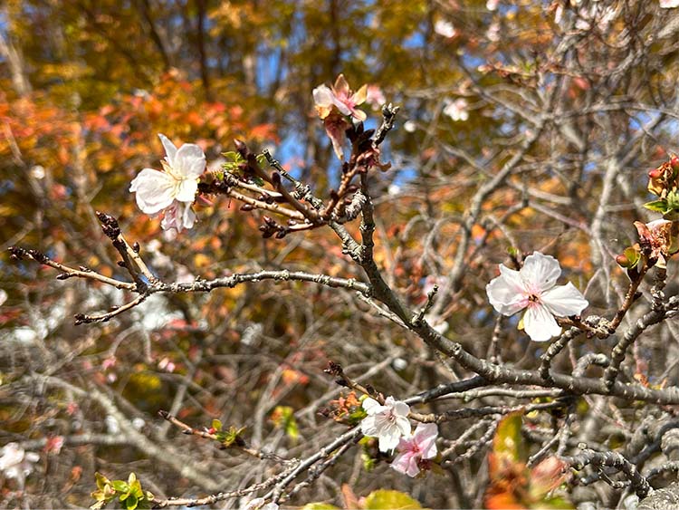 春と秋から冬にかけて咲く二季咲のサクラです。花数は少なく控え目ですが、健気に咲く花姿が可憐です。
