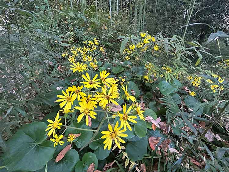光沢のある深緑色の葉と、ビビッドカラーの鮮やかな黄色い花のコントラストが美しいです。環壕入口散策路にて群生して咲いています。