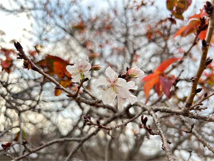 春と秋から冬にかけて咲く二季咲のサクラです。時折吹く冷たい風に耐えながら健気に咲いています。