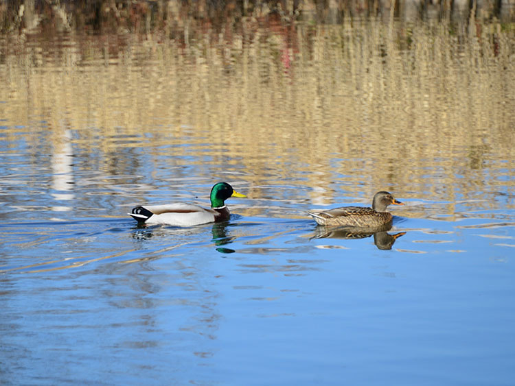 日本に渡ってくる代表的な冬鳥です。オスの頭部は鮮やかで光沢のある緑色。この特徴よりオスは「青くび」とも呼ばれています。
