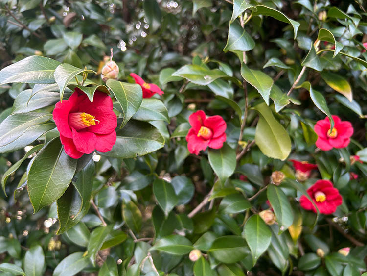 深紅の花に趣を感じます。花びらを散らすことなく、そのままの形で落花します。