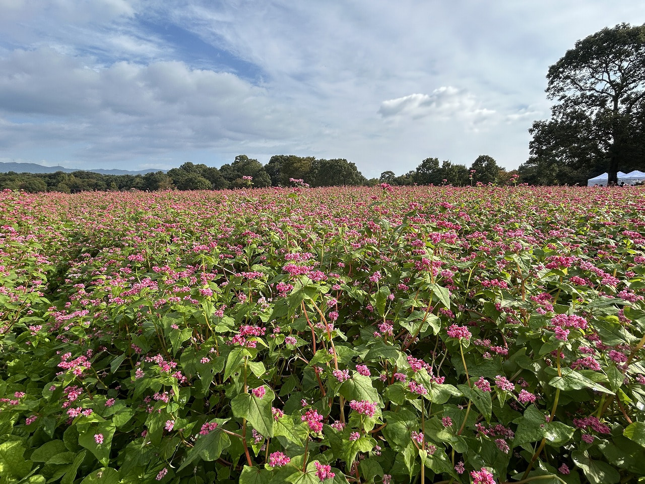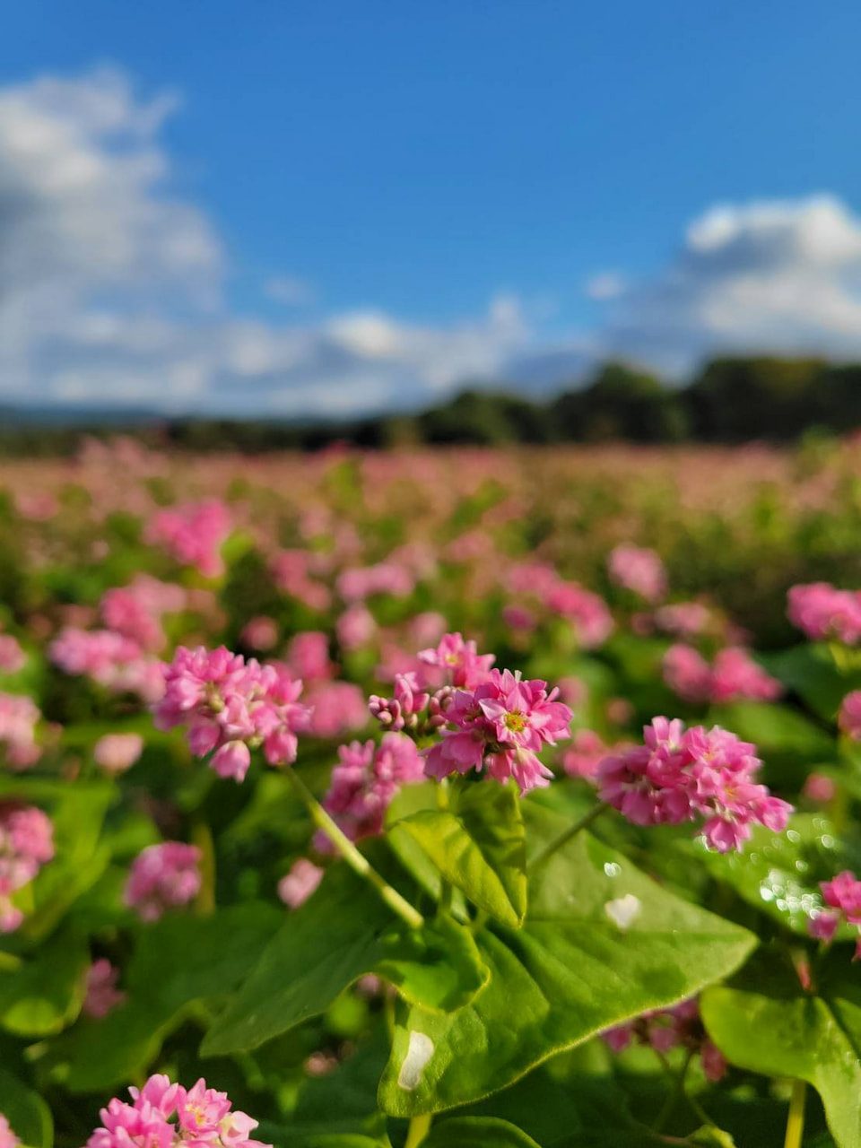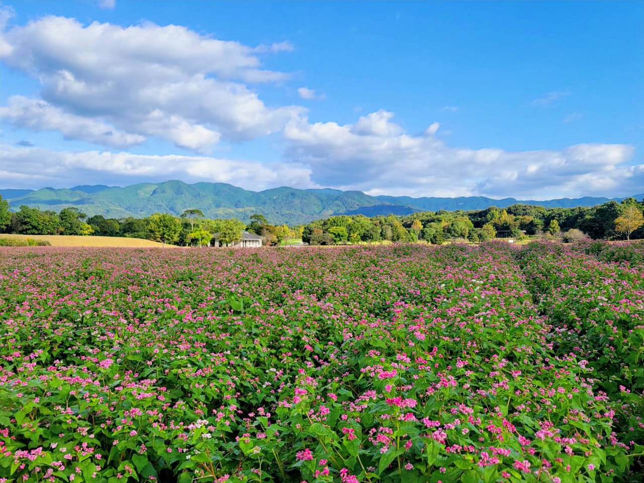 紅ソバの見頃が続いています。ソバ畑にあるベンチで、ゆっくりお花を眺めていただいたり、一面に広がるソバ畑で写真撮影もお楽しみいただけます。