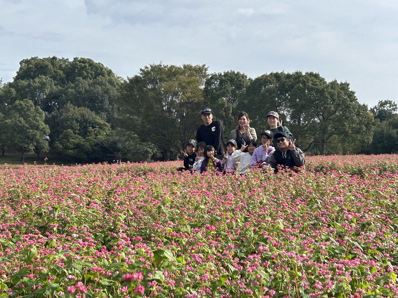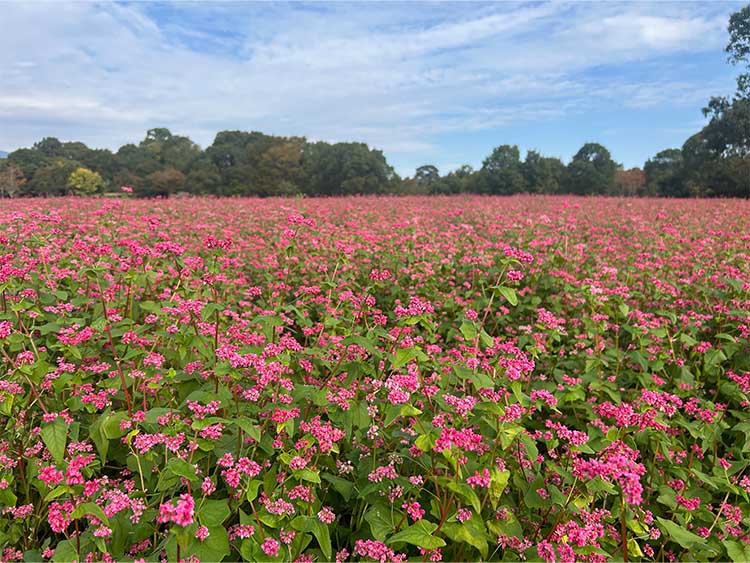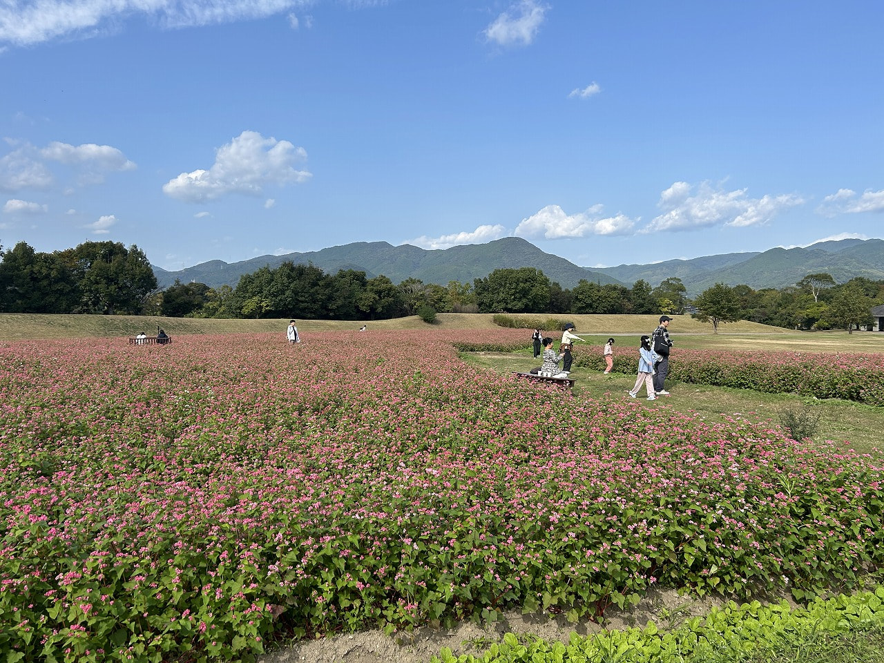 紅ソバの見頃が続いています。ソバ畑にあるベンチで、ゆっくりお花を眺めていただいたり、一面に広がるソバ畑で写真撮影もお楽しみいただけます。