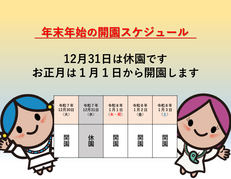 令和7年(2025年)は12月30日(火曜)まで通常開園し、12月31日(水曜)が休園日となります。