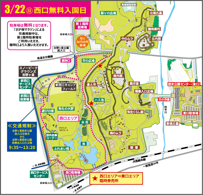さが桜マラソンの参加ランナーが、吉野ヶ里歴史公園内を周回するため、公園周辺では交通規制が行われます。